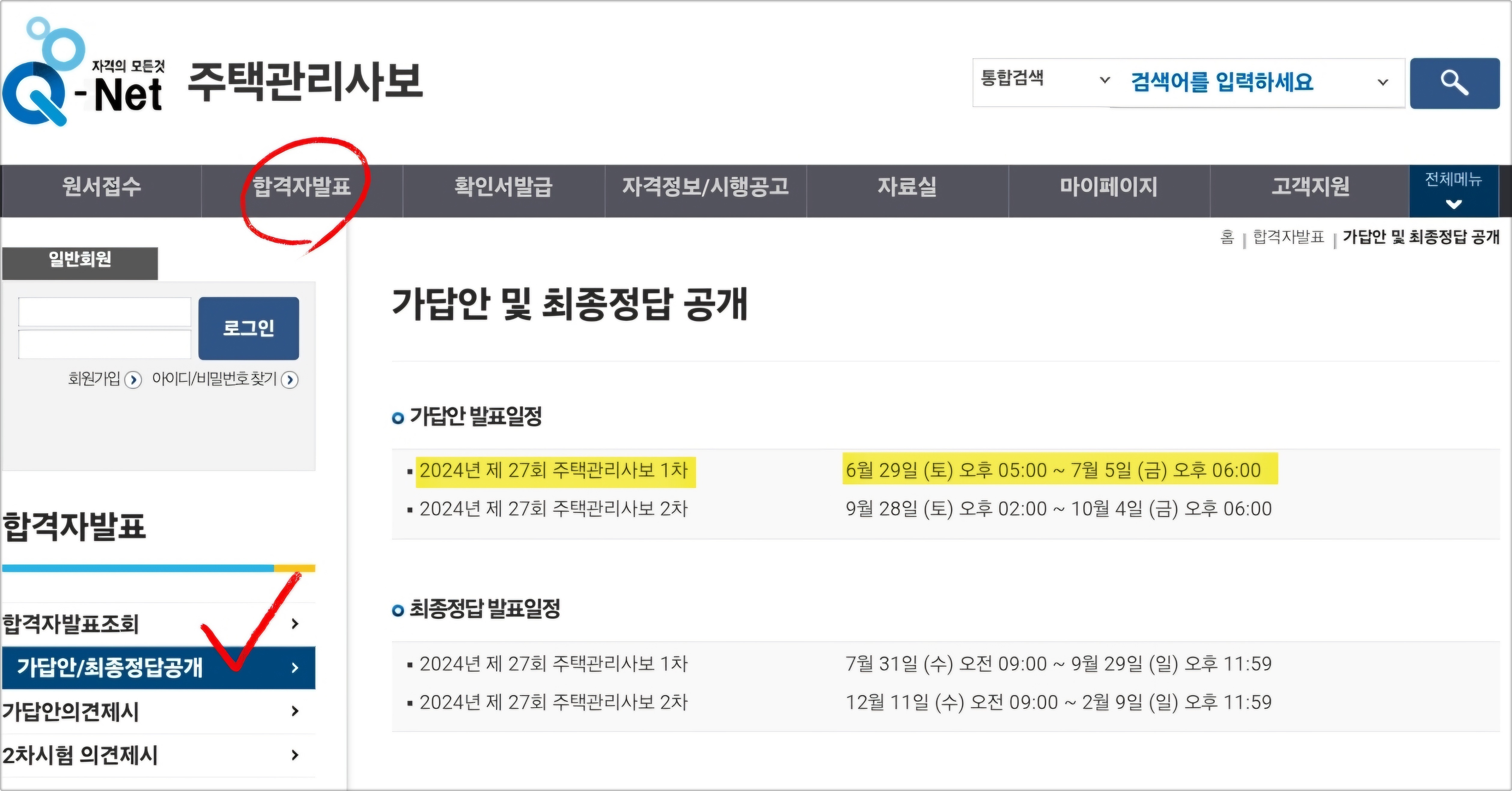 2024년도 제27회 주택관리사보 시험 가답안은 [주택관리사보 홈페이지] - [합격자발표] - [가답안/최종정답공개] 메뉴에서 확인하실 수 있습니다.