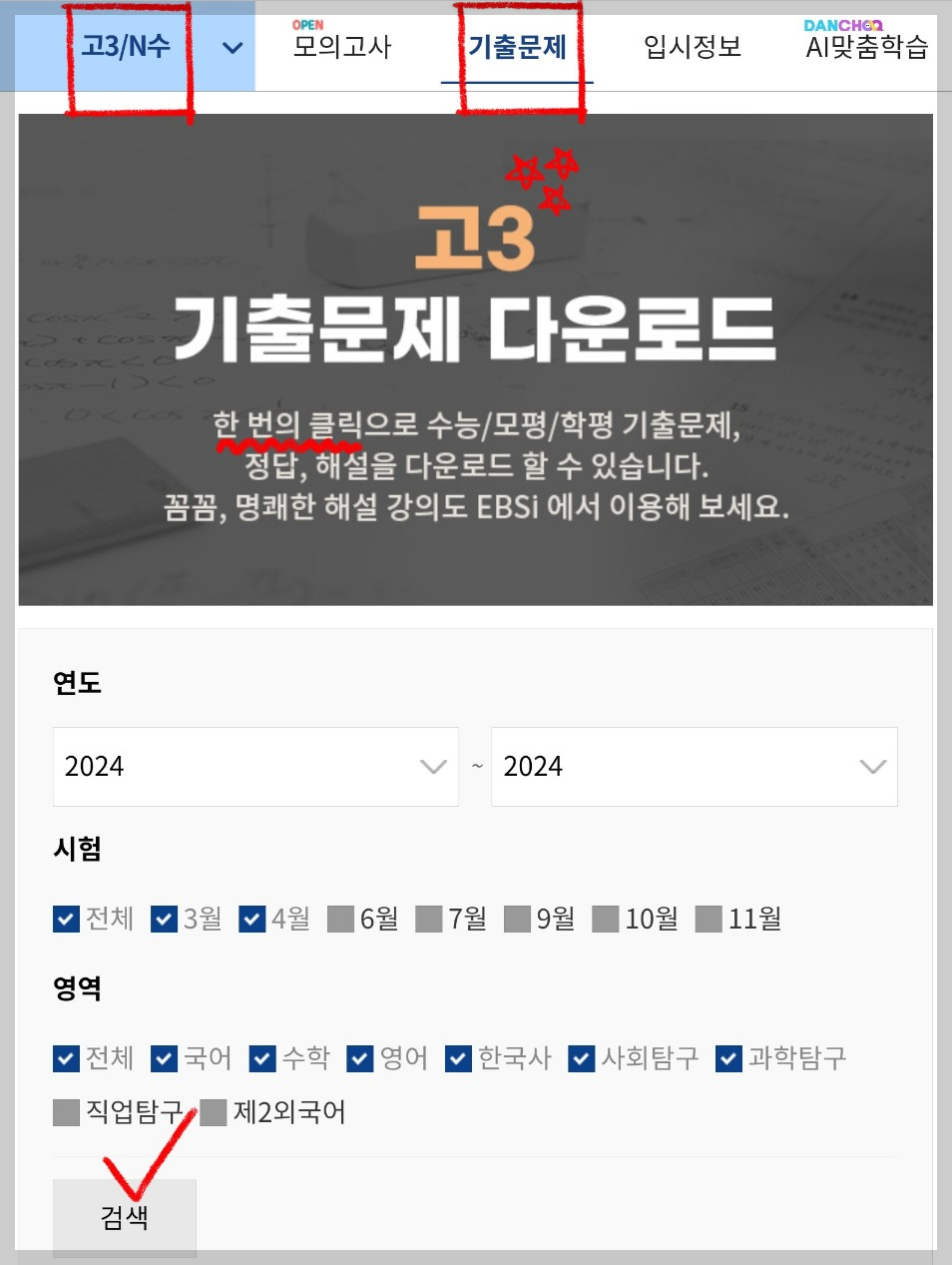 제가 홈페이지에서 확인해보니 3개년치 기출문제는 바로 이동 메뉴가 따로 없어서 조금 헤맸는데요. [고3/N수 - 모의고사 - 사전준비] 페이지의 중간부분에서 확인할 수 있었습니다.