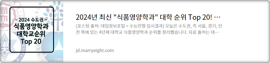 | 2024년 최신 "식품영양학과" 대학 순위 Top 20! (수도권 4년제 대학교) (0) | 2024.11.19 |