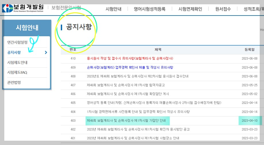 오늘 치러진 제47회 보험계리사 및 손해사정사 가답안은 보험개발원 홈페이지에서 확인하실 수 있습니다. 구체적인 경로는 [시험안내 - 공지사항]으로 접속하시면 보실 수 있으며 아래의 사진을 참고하시면 되겠습니다.