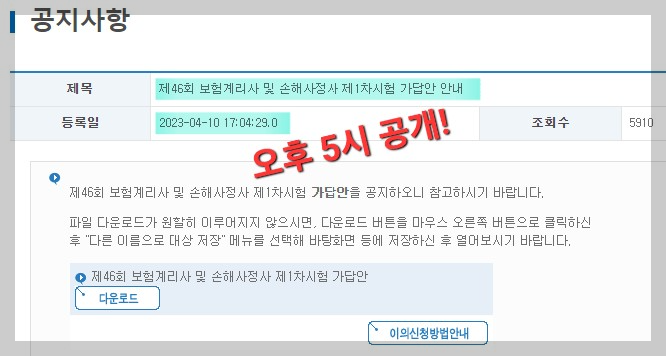 참고로, 작년인 2023년에 치러진 제46회 보험계리사 및 손해사정사 1차시험 가답안은 시험 다음날인 오후 5시경 공개가 되었습니다. 2023년 제46회 보험계리사 및 손해사정사 제1차시험이 2023. 4. 9(일)에 치러졌었는데요. 가답안의 경우는 바로 다음날인 4월 10일 월요일 오후 5시 4분쯤 공개가 되었습니다.
