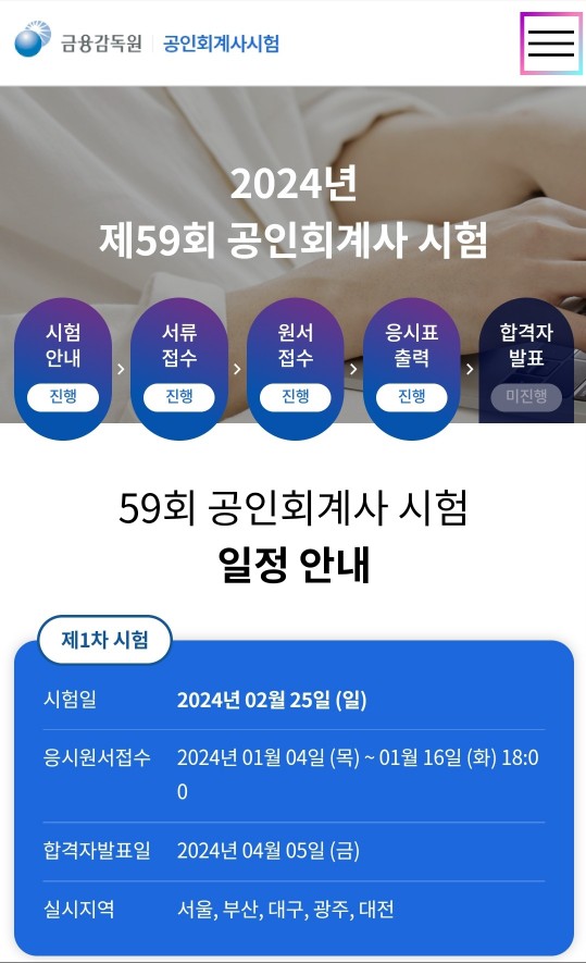 제59회 공인회계사 1차 시험 합격자는 2024년 4월 5일 금요일에 공식 발표됩니다.