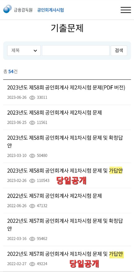 공식사이트에 접속하시면 오른쪽 상단의 줄 3개 그어져 있는 버튼을 선택 후 [자료실]에서 [기출문제] 메뉴로 접속하시면 제59회 공인회계사 시험 가답안을 보실 수 있습니다
