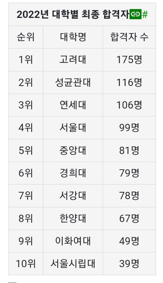 2022년 기준 대학별 최종 합격자수입니다. 2022년 공인회계사 시험에서는 고려대 출신 응시생이 가장 많이 합격하였습니다.