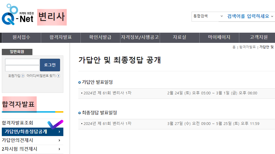 가답안 정식 공개는 큐넷 사이트에서 오늘 오후 5시에 정식으로 공개됩니다.