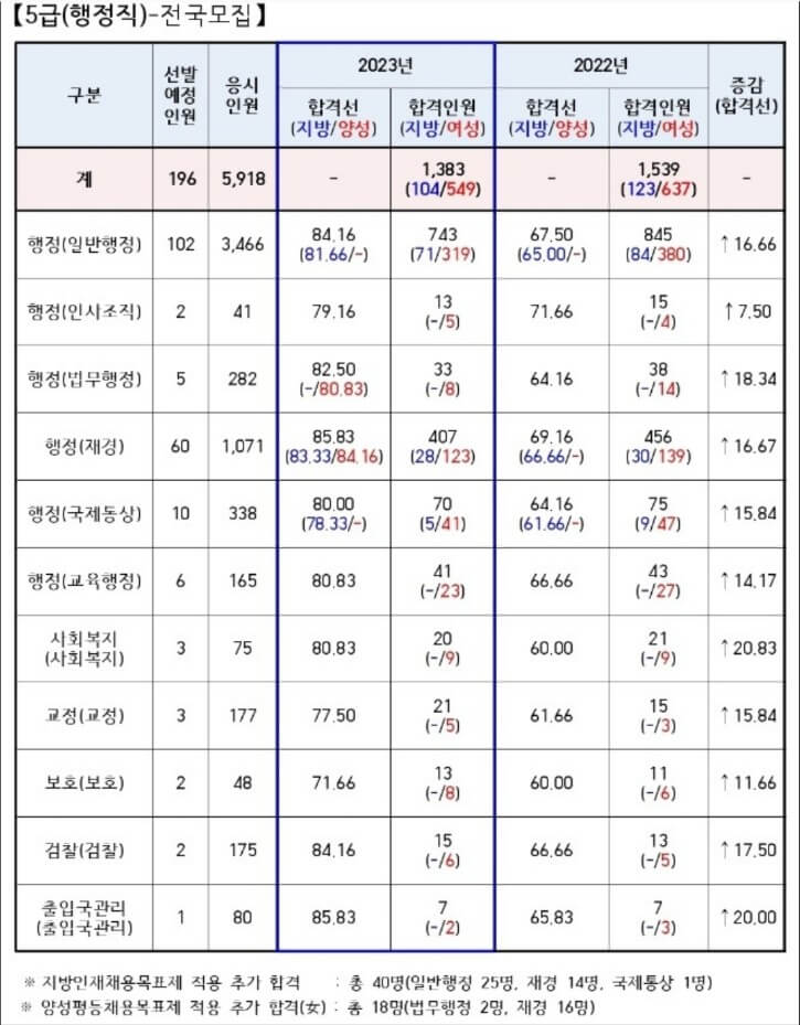 가장 최근에 진행된 2023년과 2022년의 5급 공개경쟁채용시험 행정직 합격 기준점입니다. 지난해 전국 모집 기준으로 '5급 공개경쟁채용시험의 인기직'인 재경직의 합격 기준점은 각각 85.83점으로 출입국관리직과 함께 가장 높았습니다.