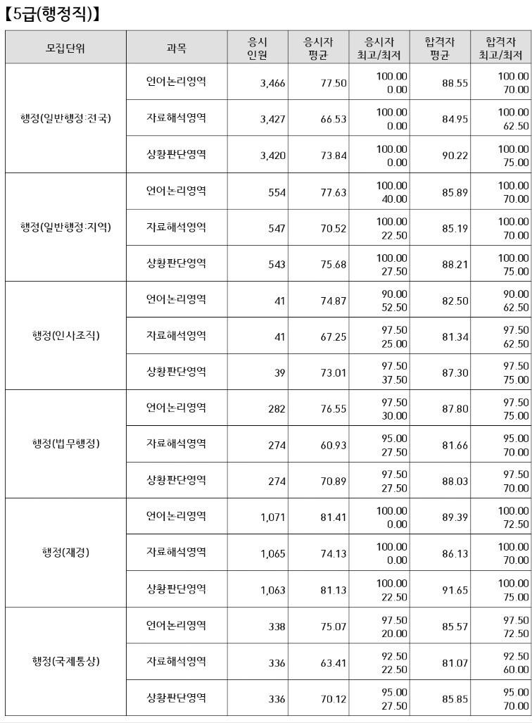 5급 공채 행정직 과목별로 합격자 평균을 내보면 상황판단영역에서는 고득점을 맞아야하겠습니다. 자료해석영역은 수험생들이 가장 어려워하는 분야로 합격자 평균 점수가 가장 낮은 과목이기도 합니다.