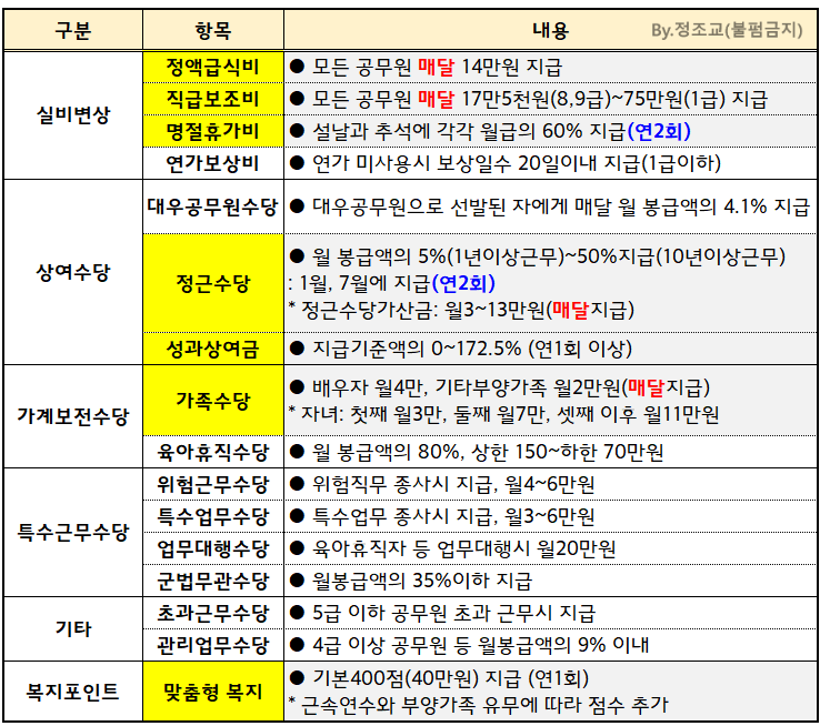 공무원은 기본급만 놓고 보면 적은 편이긴 하지만, 다양한 수당을 합하게 되면 괜찮은 보수라고 할 수 있습니다. 공무원 수당은 총18종이나 있지만, 아래의 표에서는 핵심 수당만 추려보았습니다. 따라서 재외공무원의 자녀학비보조수당이나, 하사 이상 중령의 주택 수당, 도서 벽지 근무자의 특수지 근무 수당 등 다수에게 적용되지 않는 일부 수당 항목들은 내용이 너무 길어져서 제외하였습니다.