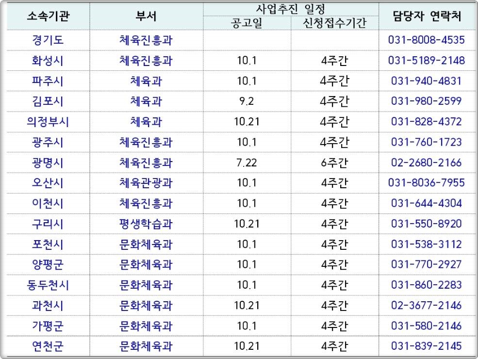 - 주의: 신청 후 지급 전이나 1차 지급 후 2차 지급 전에 타 시·군으로 전입신고를 한 경우, 새로운 전입지에서 미지급분을 받을 수 있습니다. 단, 전입지가 본 사업에 참여하는 시·군이어야 하며, 관련 문의는 해당 시·군 체육부서로 연락하시기 바랍니다.