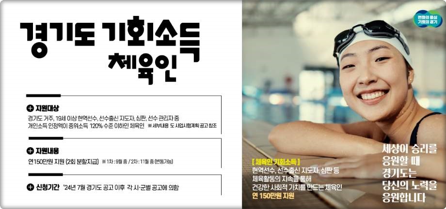 ⑤ 기회소득 지급: 선정된 체육인에게 경기도 체육인 기회소득이 2회에 걸쳐 분할 지급됩니다.