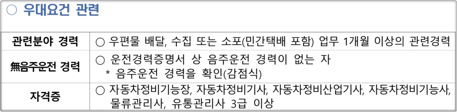 우편물 배달이나 소포 관련분야 경력이 1개월 이상이라도 있다면 우대를 해줍니다. 또한 운전경력증명서상 음주운전 경력이 없거나 관련 자격증이 있다면 이 또한 우대를 해주는데요.
