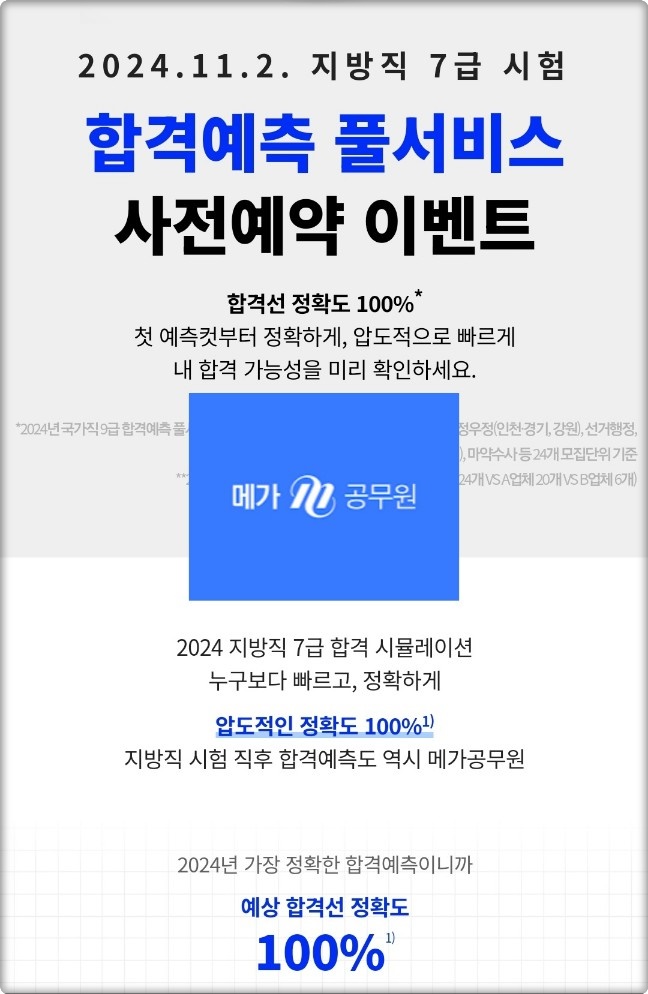 메가공무원도 2024 지방직 7급 시험에 맞춰 합격예측 풀서비스 사전예약을 진행 중입니다.