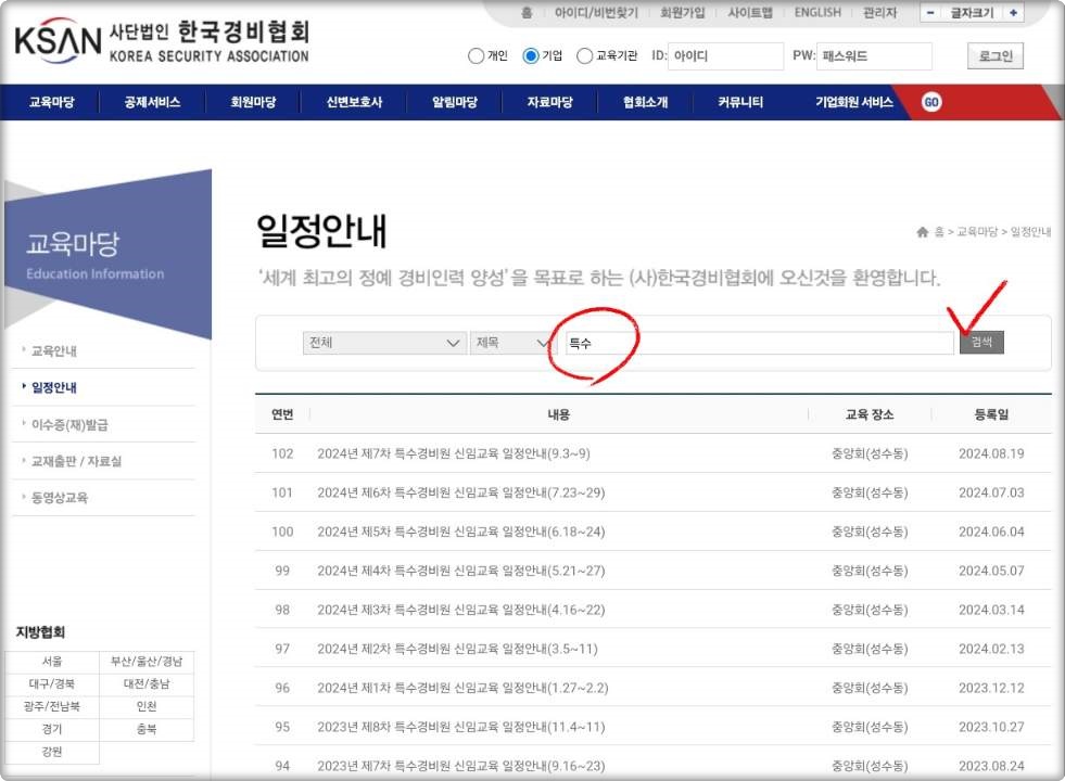 교육일정 메뉴에서 제목에 "특수"라고만 검색해도 "특수"라는 키워드만 검색하시면, 모든 특수경비원 신임교육 일정을 한눈에 확인하실 수 있습니다.