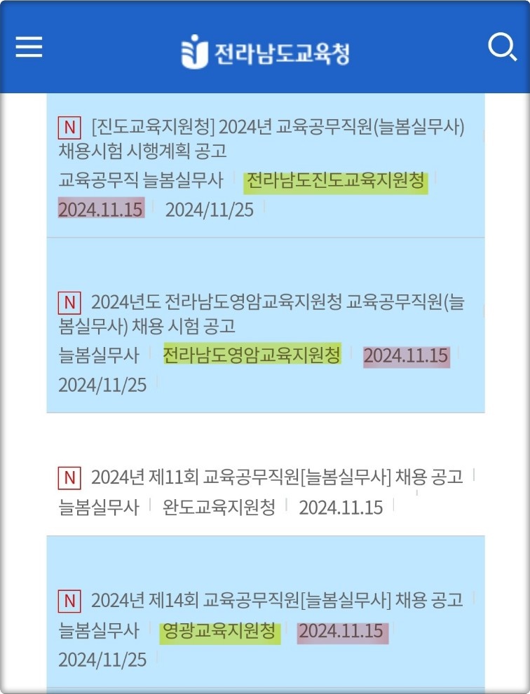 각 지역별 채용 공고는 바로 오늘인 11월 15일부터 전남 교육청 홈페이지에서 확인할 수 있는데요.