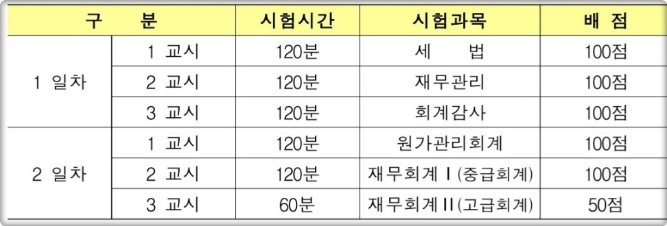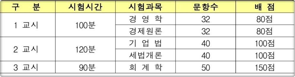 | 구분 | 시험시간 | 시험과목 | 배점 |
