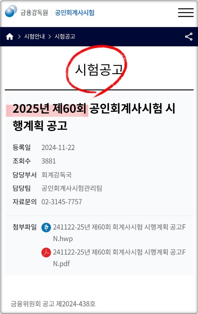 시험일정 외에 2025년도 제60회 공인회계사 시험의 시험장소와 시간, 합격자 발표 정보는 [금융감독원 공인회계사시험 홈페이지]에서 확인할 수 있습니다.