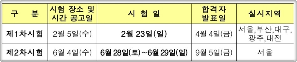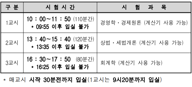 2024년도 시험시간표와 비교하여 시험시간이 일부 변경되어, 정확한 시험 시간표는시험장소와 함께 발표될 '시험공고 페이지'에서 한번 더 확인하시기 바랍니다! (👉 시험공고 페이지 바로가기)