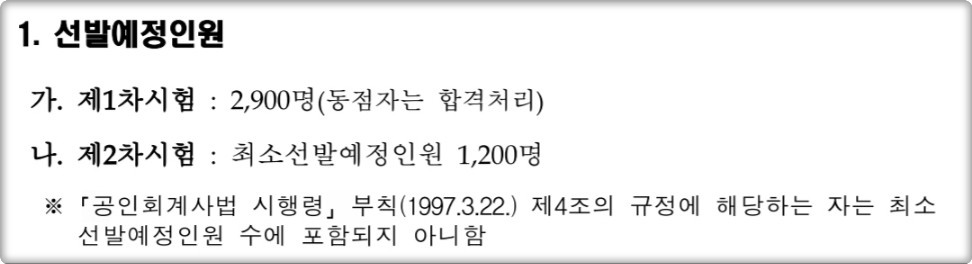 내년 2차 선발인원은 "1200명"으로 올해보다 50명 줄어든 숫자인데요. 선발 인원이 줄어든 이유는 수습기관을 찾지 못한 회계사가 많아졌기 때문이라고 합니다.