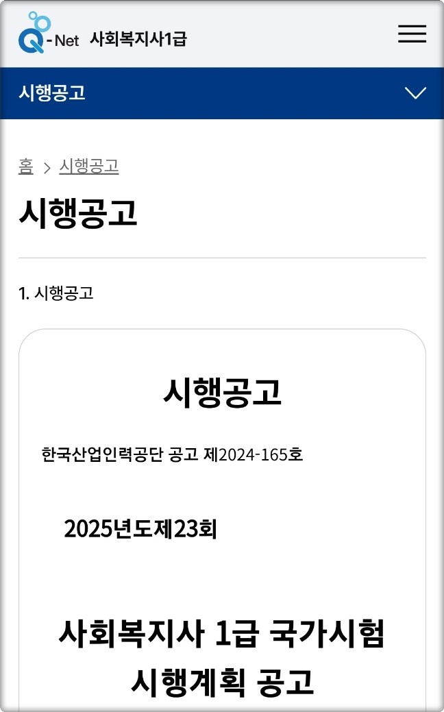 (큐넷 사회복지사 1급 홈페이지 / 시험공고)