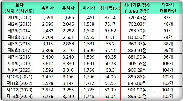 하지만 2016년 제5회 시험 이후로는 상황이 크게 달라졌습니다. 응시자의 수준이 향상되면서 시험 난도가 크게 상승했고, 이에 따라 합격률도 50% 안팎으로 감소했습니다.