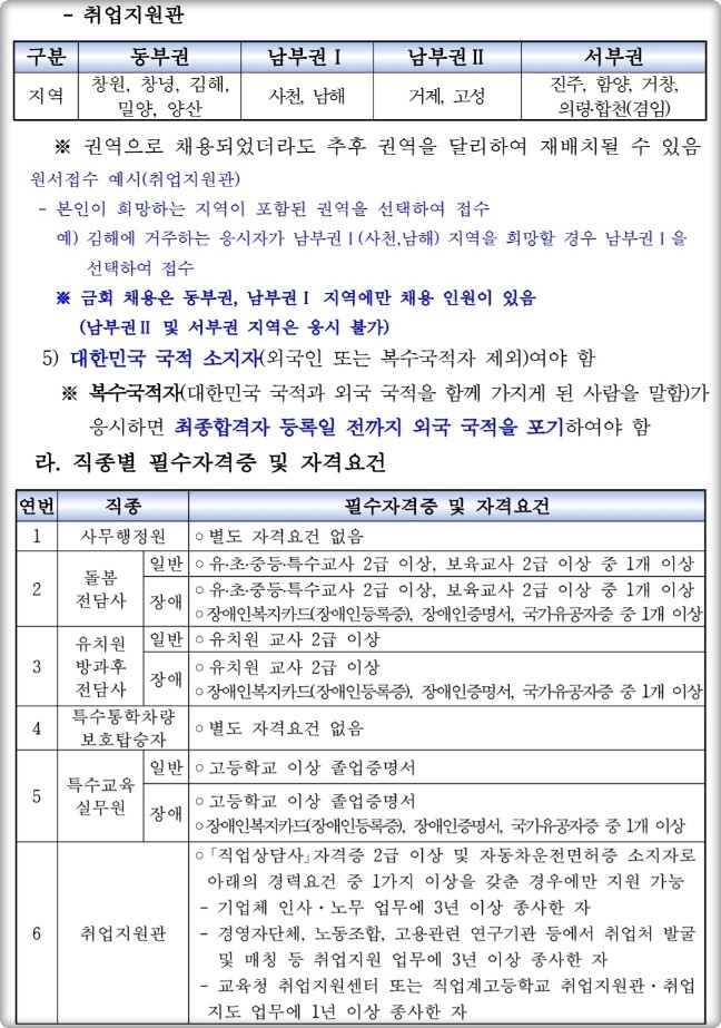 - 해당 직종: 조리사, 조리실무사, 유치원방과후전담사, 취업지원관