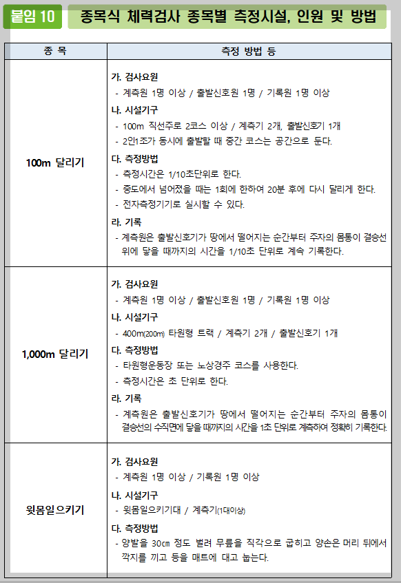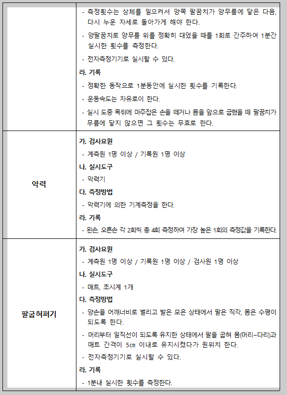 - 장비/인원: 매트, 초시계 1개, 계측원·기록원·검사원 각 1명 이상.