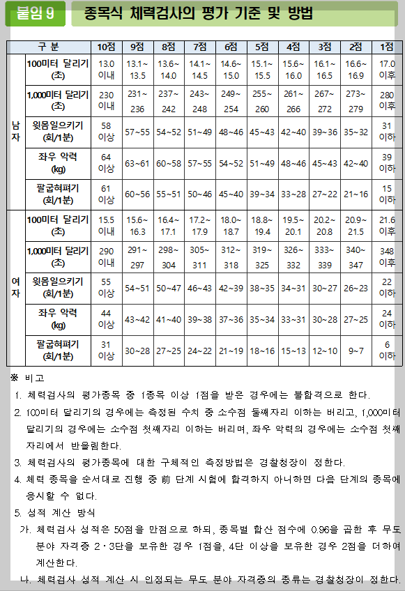 이때의 경찰 공무원 체력검정표 기준을 충족해야 하며, 단 1종목이라도 1점이면 불합격이라는 점은 반드시 유의하셔야 해요.