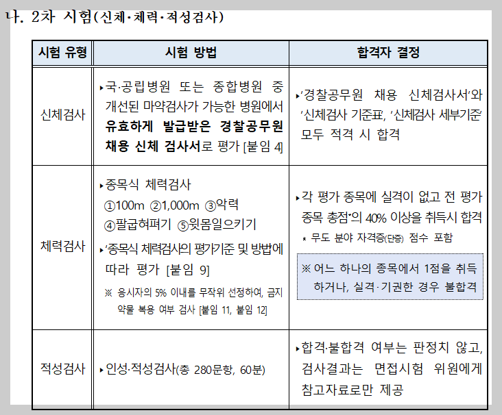 필기 합격자에 한해 2차 시험이 진행되며, 여기서 경찰 공무원 체력시험이 포함됩니다.