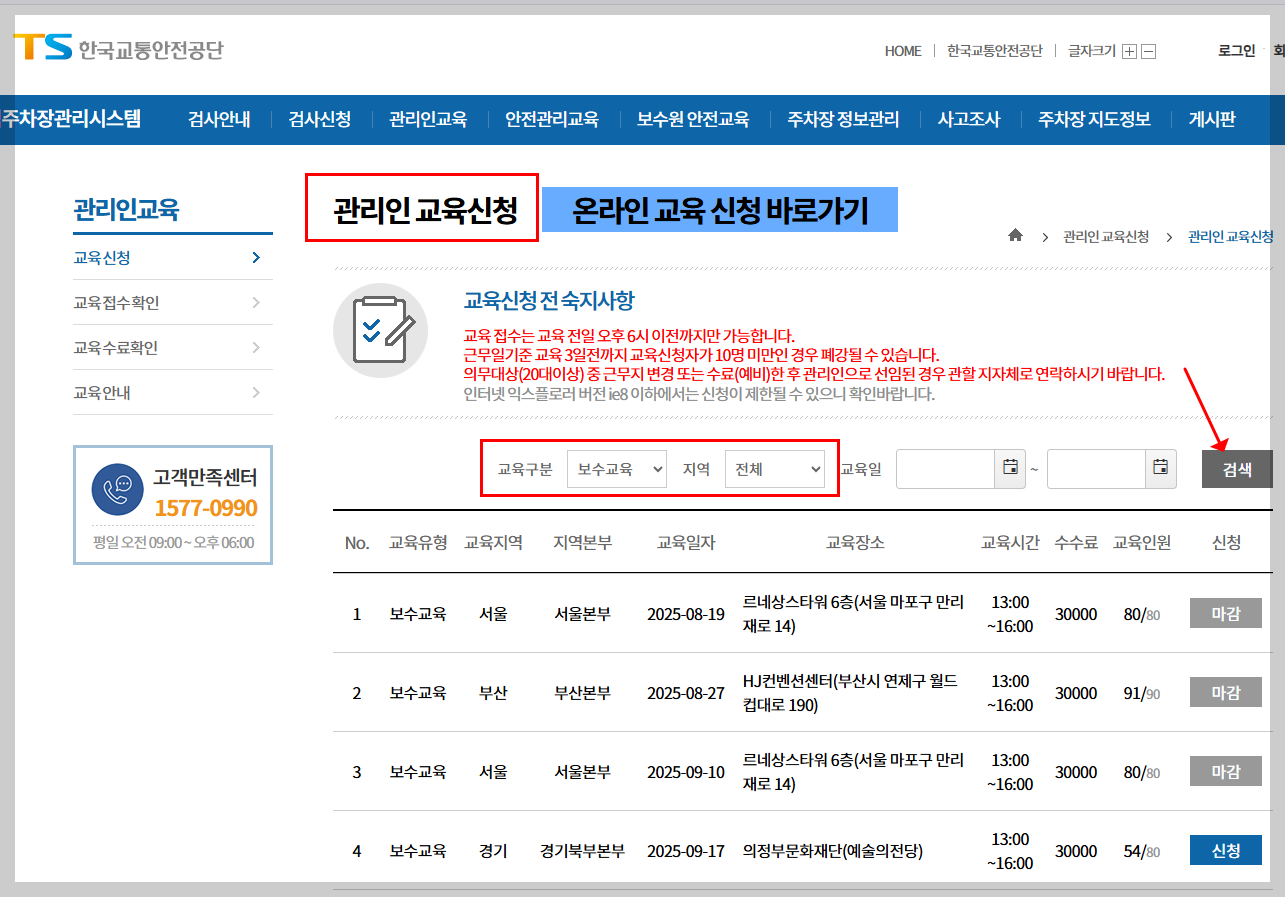 신청 시에는 ‘교육구분’과 ‘지역’을 선택하고, 원하는 날짜를 검색해 접수하면 됩니다.