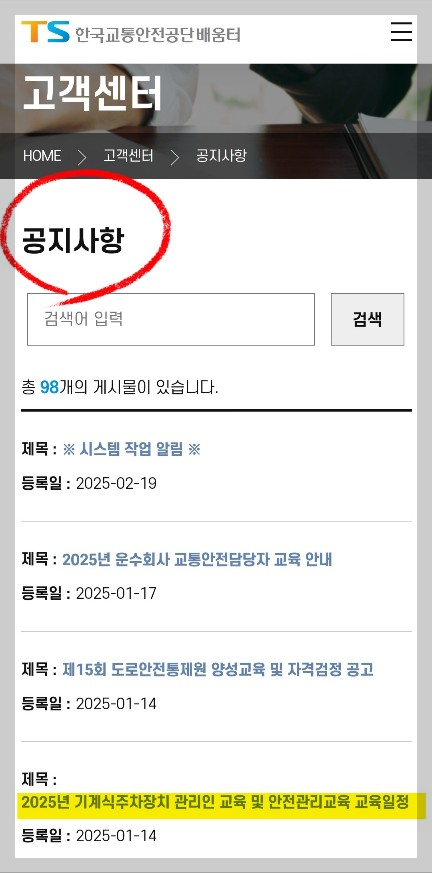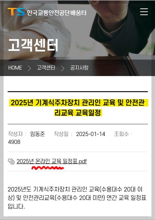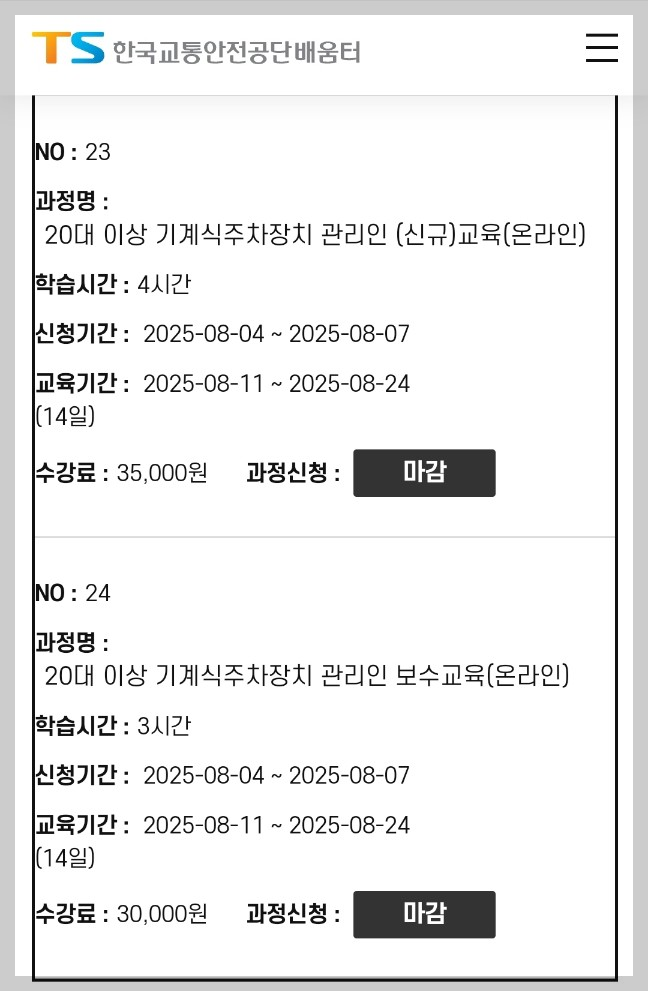 TS한국교통안전공단배움터 홈페이지의 공지사항 출처에 따르면 2025년도 기계식주차장 관리인 온라인교육은,