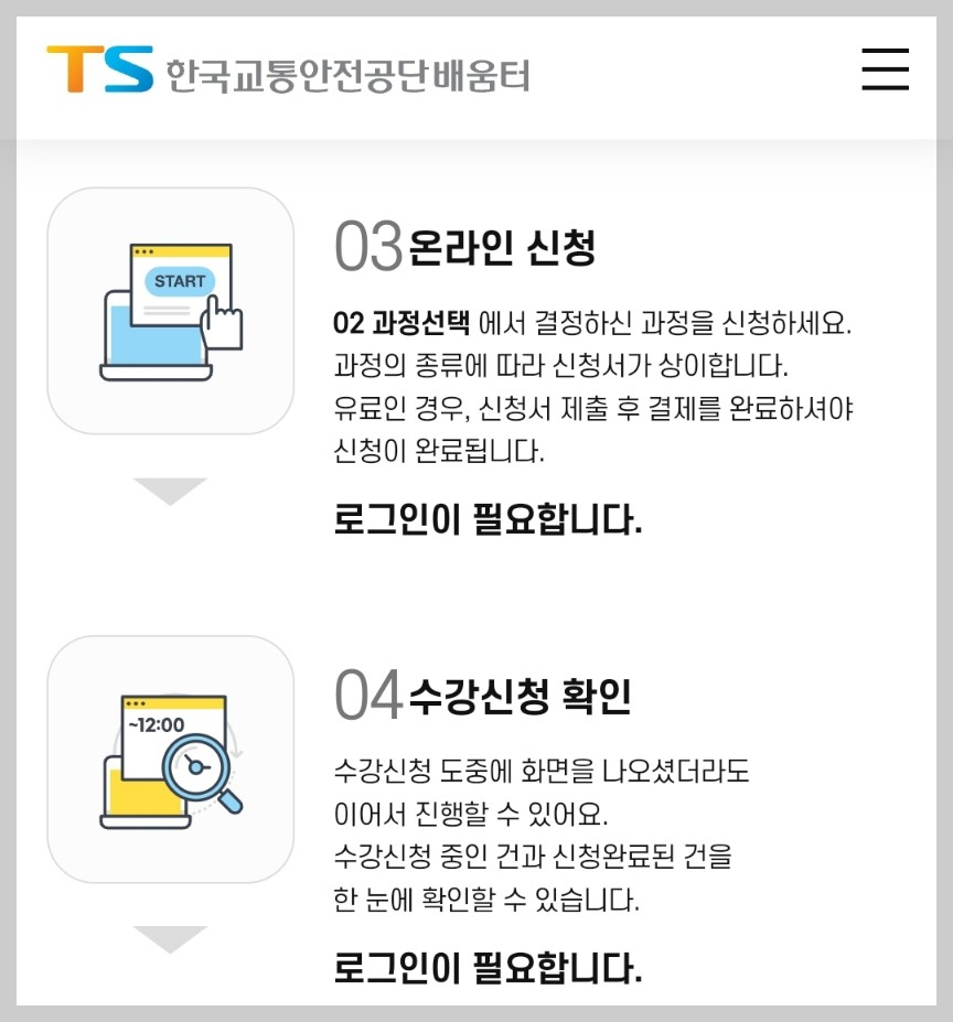 TS 배움터 홈페이지에서 회원가입 후 과정선택 → 신청서 작성 → 결제 → 수강신청 확인 → 학습 진행 → 수료증 발급 순으로 진행됩니다.