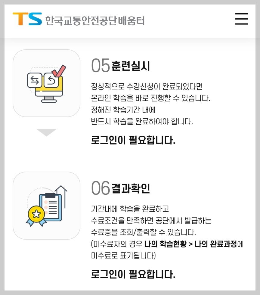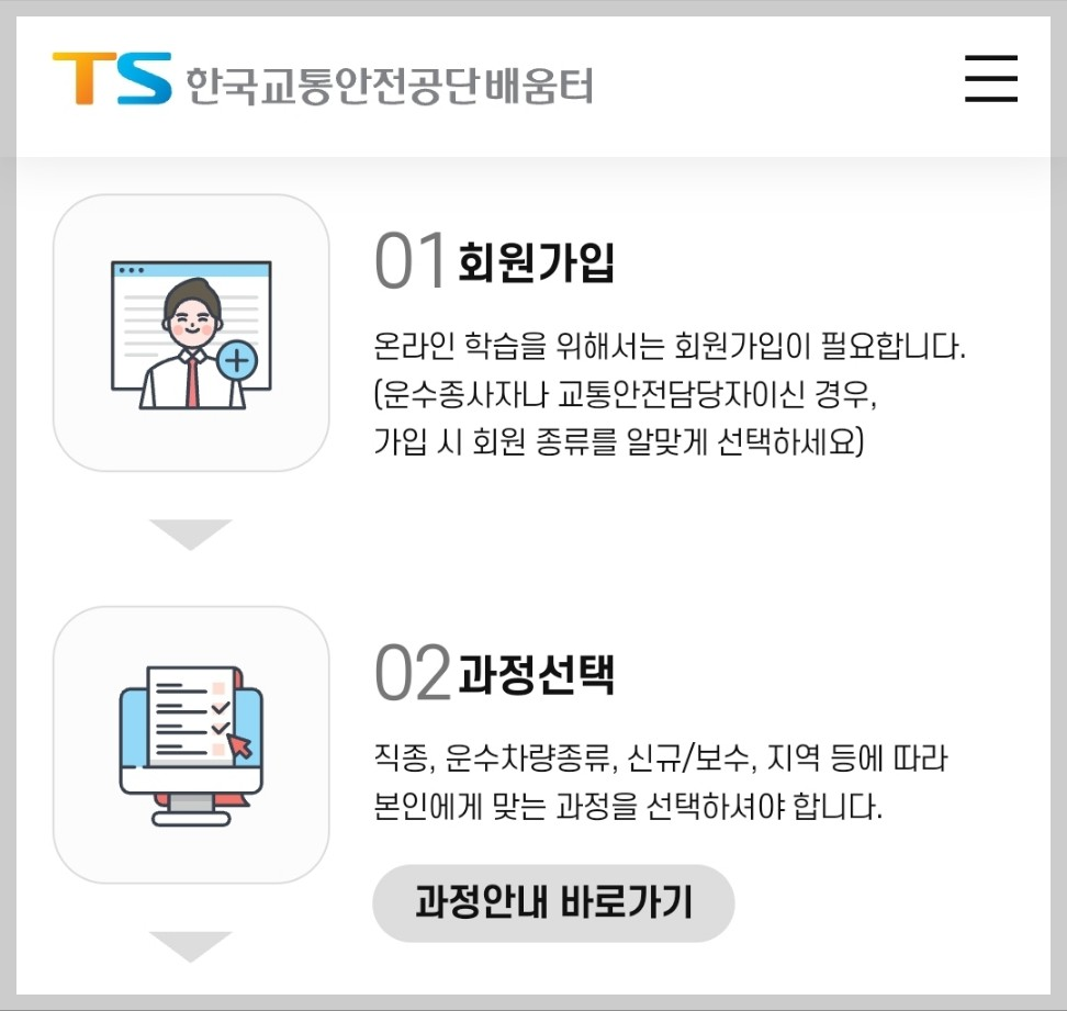 TS 배움터 홈페이지에서 회원가입 후 과정선택 → 신청서 작성 → 결제 → 수강신청 확인 → 학습 진행 → 수료증 발급 순으로 진행됩니다.