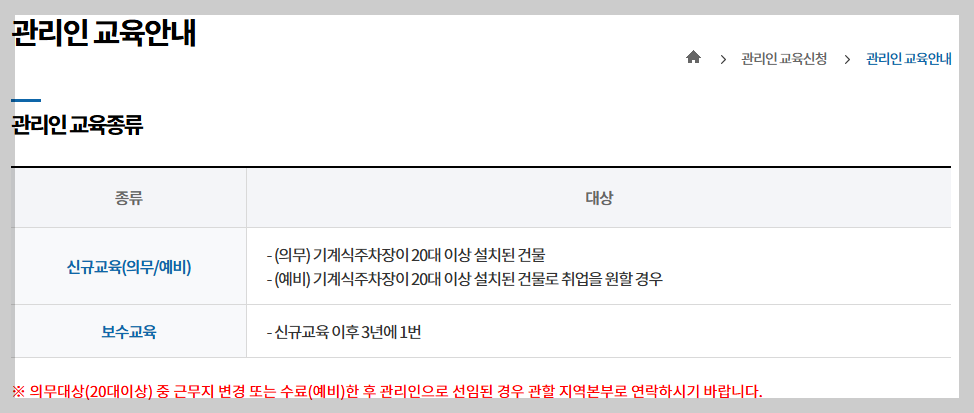 교육은 ‘신규교육’과 ‘보수교육’으로 나뉘며, 신규교육은 처음 관리인으로 선임될 때, 보수교육은 그 이후 3년마다 1회씩 이수해야 하는데요.