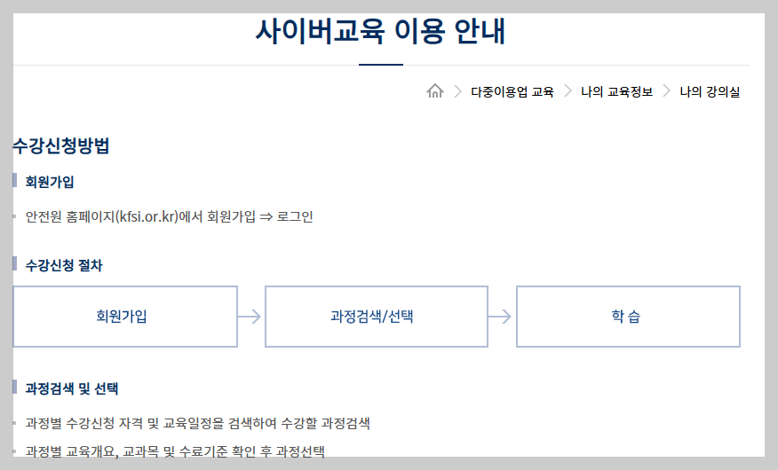 또한 교육은 사이버(온라인) 과정으로, 총 4시간 분량의 콘텐츠를 이수하게 되며, 진도율 90% 이상을 채우면 수료가 인정됩니다.