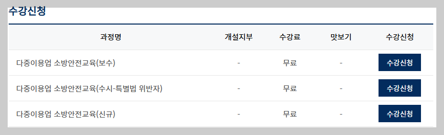 로그인 후 상단 메뉴에서 [교육신청] → [다중이용업 종사자 교육] 항목으로 이동하면 각 교육과정을 확인하실 수 있습니다.