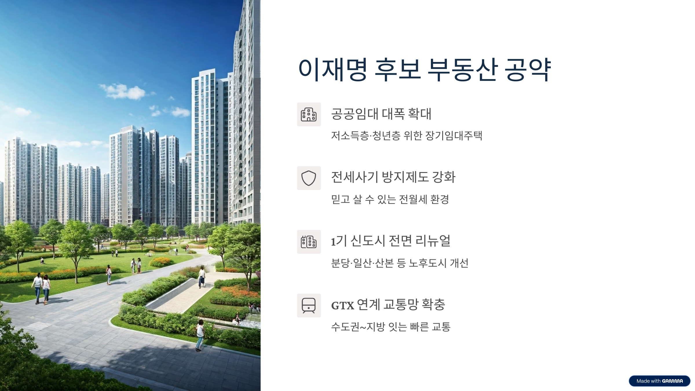 이재명 후보의 부동산 공약은 실수요자 중심입니다. ‘사는 집은 기본 권리다’라는 기조 아래, 공공임대 확대와 청년·1인가구 지원을 강화하겠다는 방침을 내세웠습니다.