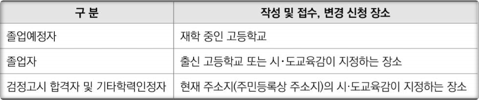 : 출신 고등학교에 응시원서를 제출하는 것이 원칙입니다. 그러나 다음과 같은 경우에는 다른 장소에서도 접수가 가능합니다: