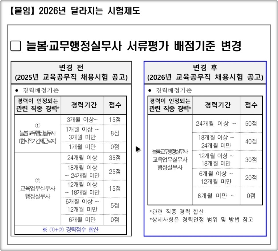 2026년부터 채용되는 늘봄·교무행정실무사의 경력 배점 상한선이 기존 15점에서 50점으로 대폭 상승할 예정입니다.