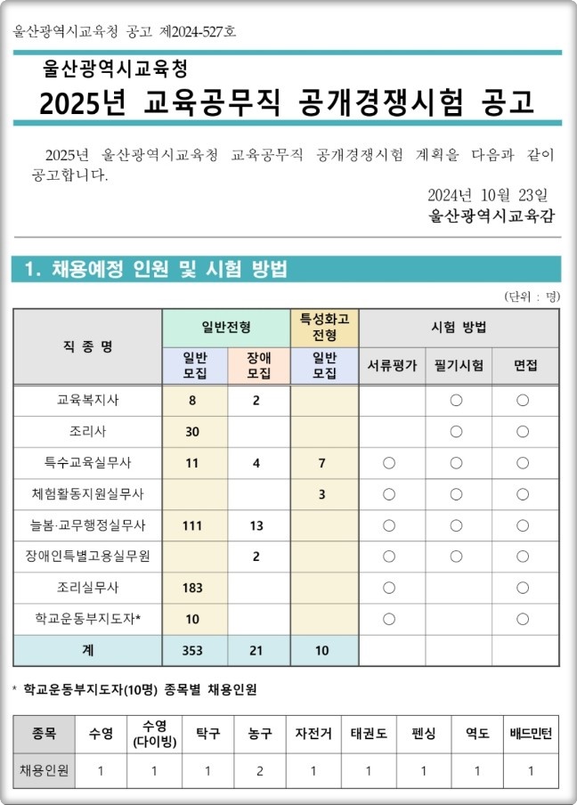 울산광역시 교육청에서 2025년도 교육공무직 공개경쟁시험이 공고되었습니다.