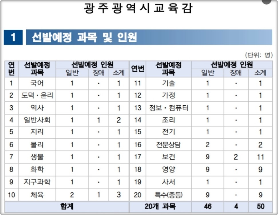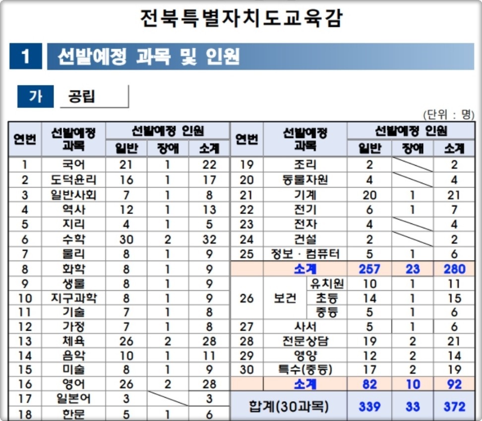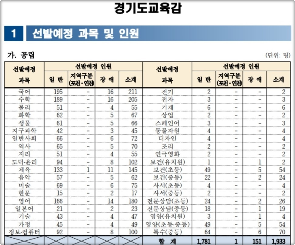 경기도는 특히 많은 인원을 선발하는 지역으로, 서울, 부산, 충청남도 역시 다양한 과목에서 상위권의 티오를 차지하는데요.