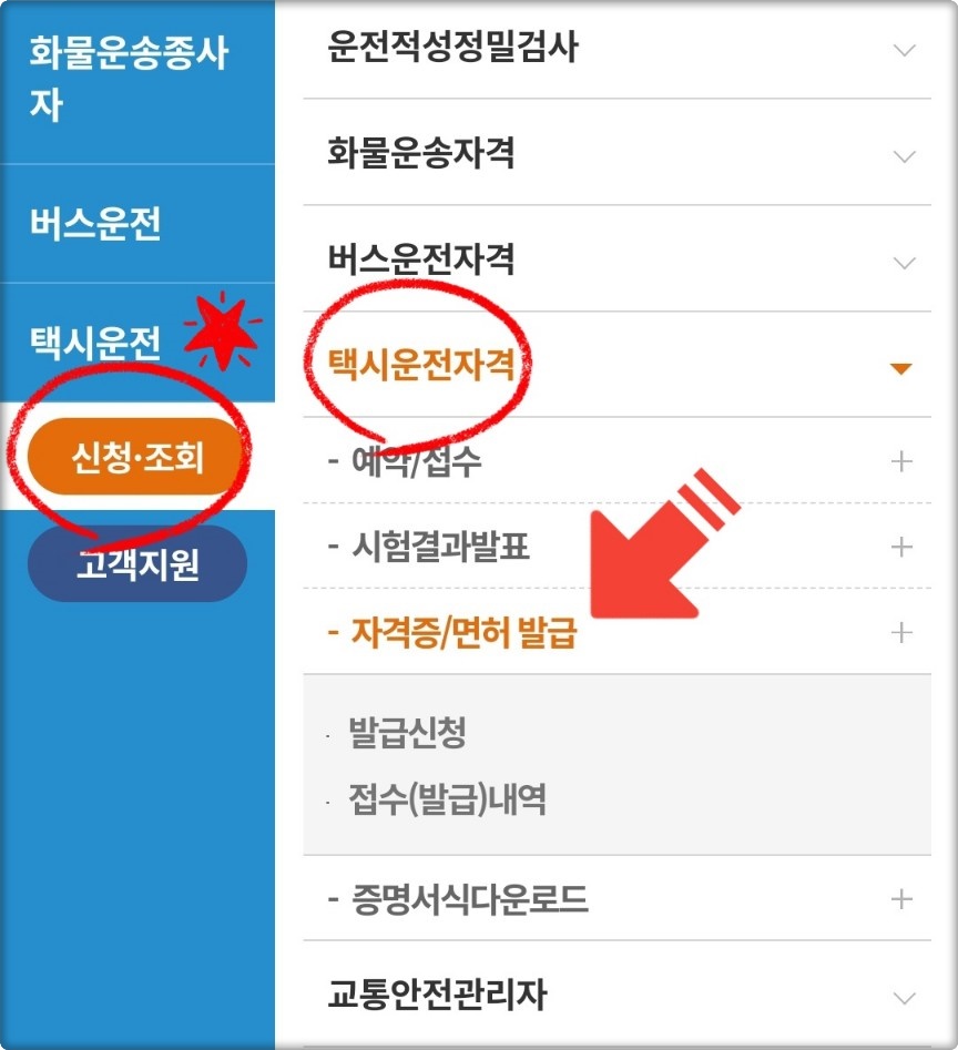 - 경로: 신청조회 > 도로자격 > 택시운전 > 자격증/면허발급 > 본인인증 > 발급신청