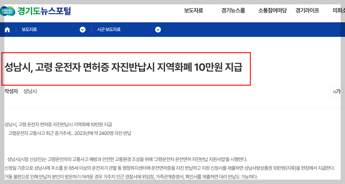 경기도 성남시는 운전면허를 자진 반납하면 10만 원짜리 성남사랑상품권을 드립니다.