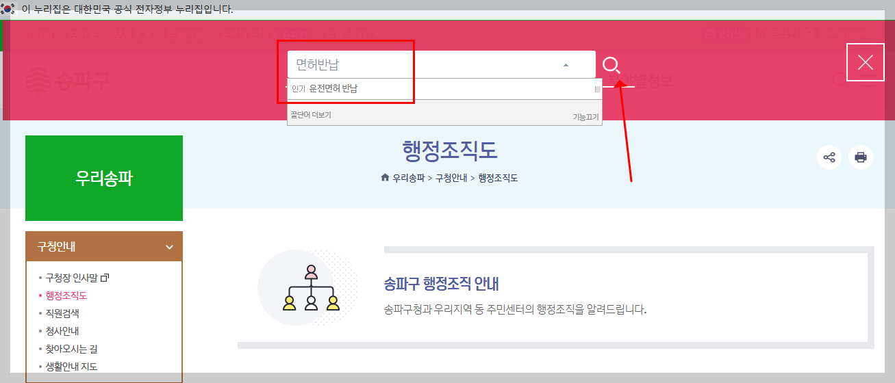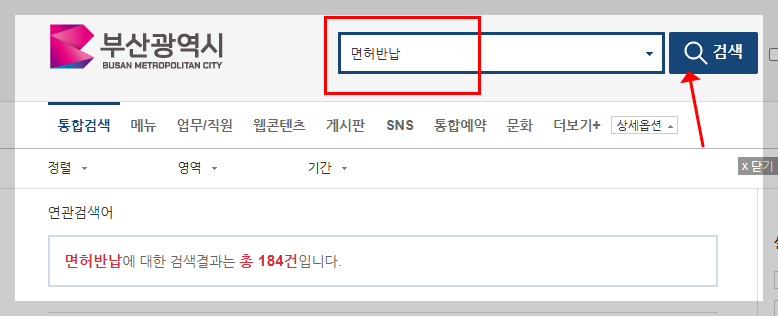 위쪽에 보이는 검색창에 ‘운전면허 반납’ 또는 ‘면허반납’이라는 글자를 입력하고 돋보기 검색 버튼을 눌러보세요.