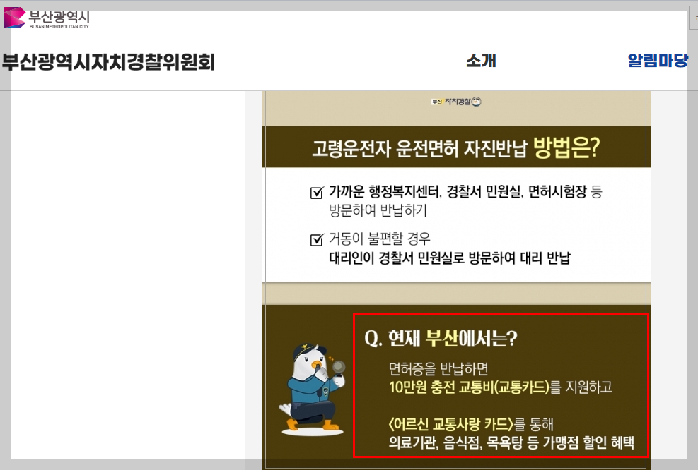 부산시는 면허를 반납하신 어르신께 10만 원 충전된 교통카드를 드리며, 병원이나 음식점, 목욕탕 등에서 사용할 수 있는 추가 할인 혜택도 있습니다.