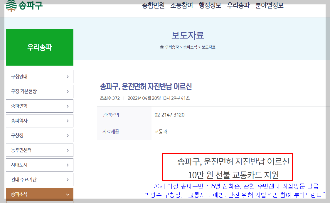 예를 들어, 서울 송파구는 70세 이상 어르신 중 선착순 785명에게 10만 원짜리 선불 교통카드를 지급합니다.