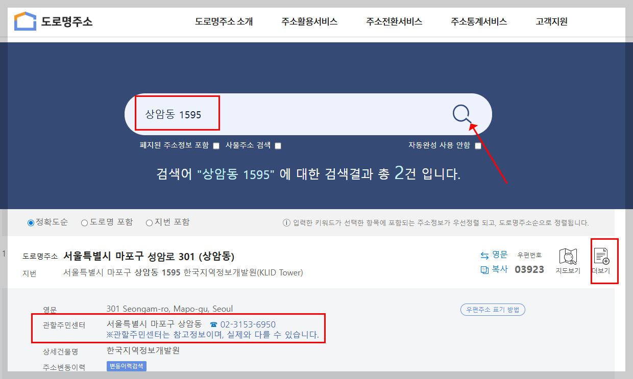 주소 하단에 표시된 “관할주민센터” 항목을 확인합니다. 예: "서울특별시 마포구 상암동", 전화번호 포함