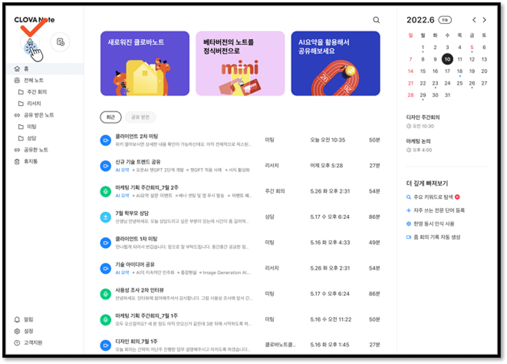 3) 홈 왼쪽상단의 [녹음] 또는 [새 노트] 버튼을 클릭해서 녹음할 수 있습니다.