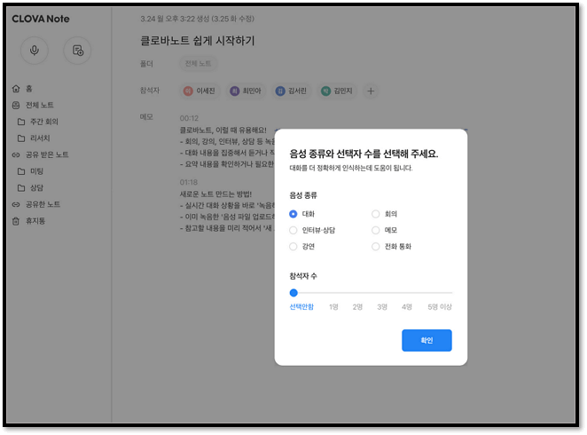 - 음성종류와 참석자 수를 선택하면 대화를 정확하게 인식하는 데 도움이 됩니다.